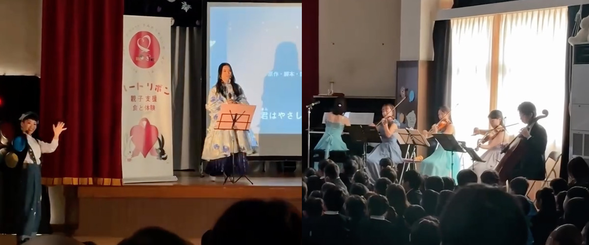 2025年11月11日(火)、篠崎保育園にて、ライブ絵本ルーミーパークを開催しました。ライブ絵本は、絵本作家・祐彩(ゆうせい)さんの絵本、「コロネのおしりはどっち?」「かいとうあっというま」「ハレとアメのきらきらあつめっこ」を、音楽(四重奏)、映像、ナレーションと歌で表現する、ライブステージです。今回、坂本自動車工業株式会社坂本様のご協賛によって実現しました。