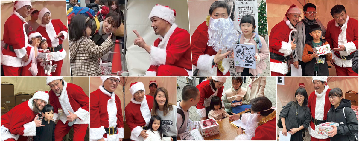 2025年12月21日(日)、新橋駅前SL広場にて、石田純一さん、魔裟斗さん、セイン・カミュさん、岡崎郁さん、中野浩一さん、 吉田秀彦さん、柿本賢治さん、池谷幸雄さん、宮澤ミシェルさん、大野均さんが サンタクロースになって、クリスマスケーキを配布しました。子育て家庭に配布したケーキは「1150個」です。他、吉本興業東京本部、越谷アルファーズ公式戦に於いて、また児童養護施設の子どもたちに配布。合計で、クリスマスケーキ2000個を届けました!