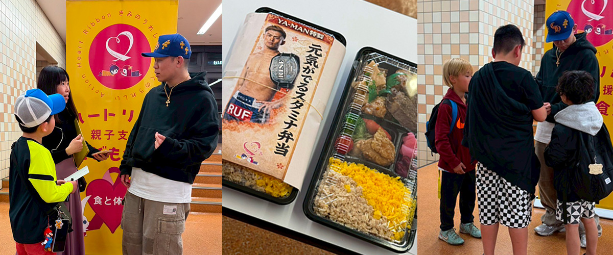 2026年3月28日、ハートリボン大使で格闘家のYA-MAN(ヤーマン)さんが、日本キックボクシング界の年間最大イベント「RISE ELDORADO 2026」に、ひとり親家庭を100名をご招待しました。YA-MANさん自ら、「YA-MAN特製!元気がでるスタミナ弁当」を渡していたただきました。立ち技打撃格闘技RISEを、両国国技館という場所で生観戦できる貴重な体験となりました。