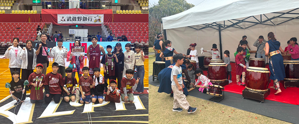 プロバスケットボール「越谷アルファーズ」のホームゲームにて、ひとり親家庭50名をご招待しました。和太鼓演奏&お子様和太鼓演奏体験もあり、選手との記念撮影も行いました。子どもたちにとって、大興奮の忘れられない1日となりました。